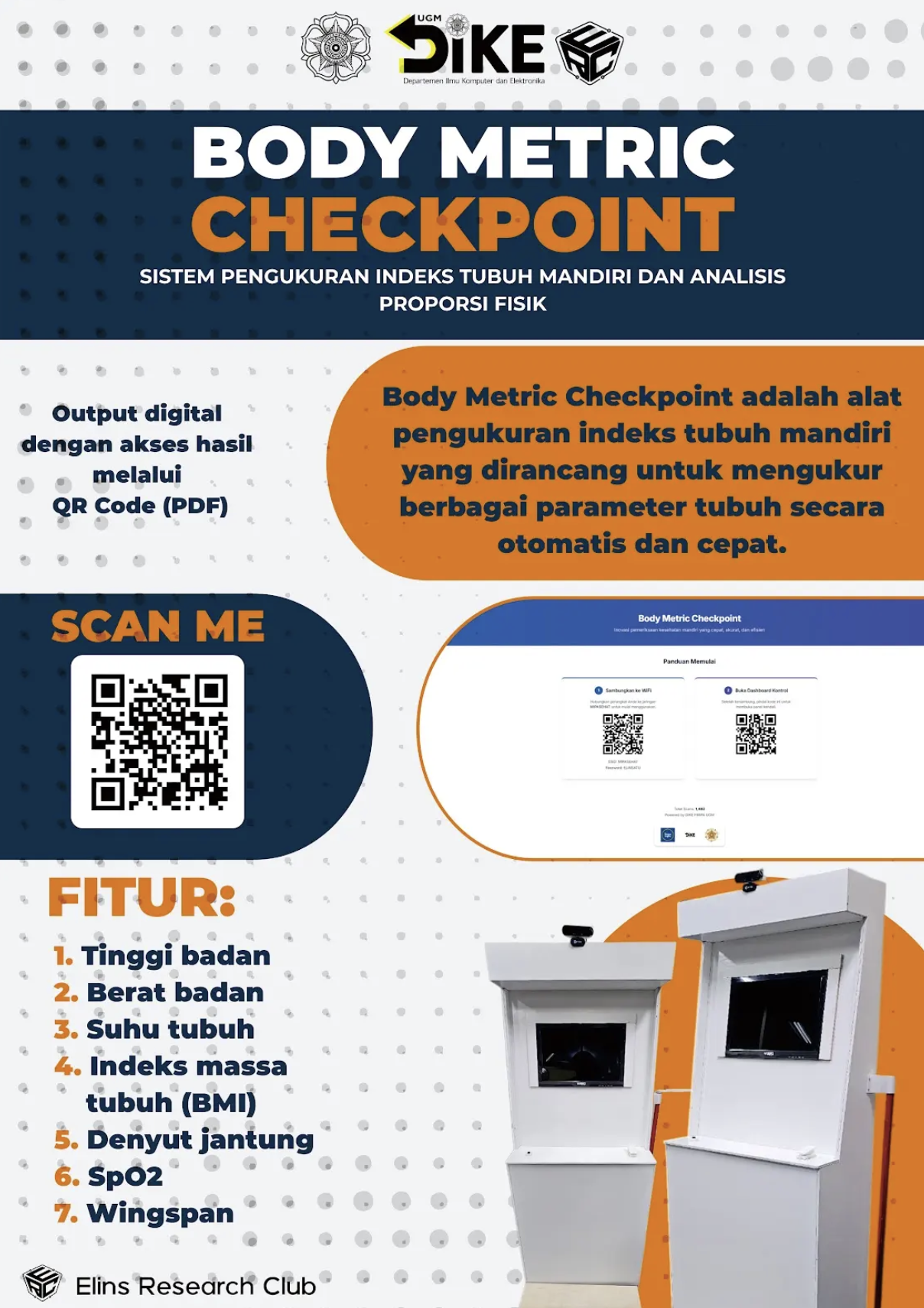 Body Metric Checkpoint merupakan sebuah perangkat otomatis yang dirancang agar pengguna dapat melakukan pemeriksaan indeks-indeks tubuh secara mandiri. Perangkat ini dirancang untuk mengukur berbagai parameter yaitu tinggi badan, berat badan, suhu tubuh, Indeks Massa Tubuh (BMI), denyut jantung, dan saturasi oksigen (SpO2). Hasil pemeriksaan dianalisis dan disajikan dalam format yang mudah dipahami oleh pengguna serta dapat diakses melalui QR code yang dikonversi ke dalam bentuk PDF. Body Metric Checkpoint diharapkan mampu berkontribusi dalam peningkatan kualitas hidup dan upaya pencegahan penyakit. Selain itu, inovasi ini juga mendukung target jangka panjang seperti peningkatan angka harapan hidup dan pencapaian visi Healthy Society 2050, di mana masyarakat memiliki kesadaran penuh akan pentingnya kesehatan preventif.